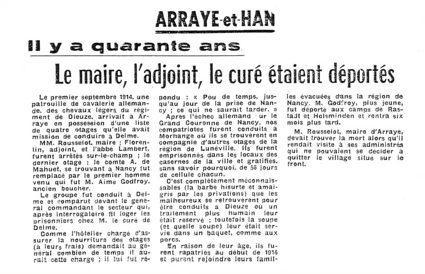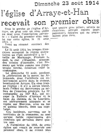 Retrouver l'histoire d'Arraye et Han et Ajoncourt, travail effectué lors de la commémoration  des 100 ans du début de la guerre, en août 2014.   à redécouvrir