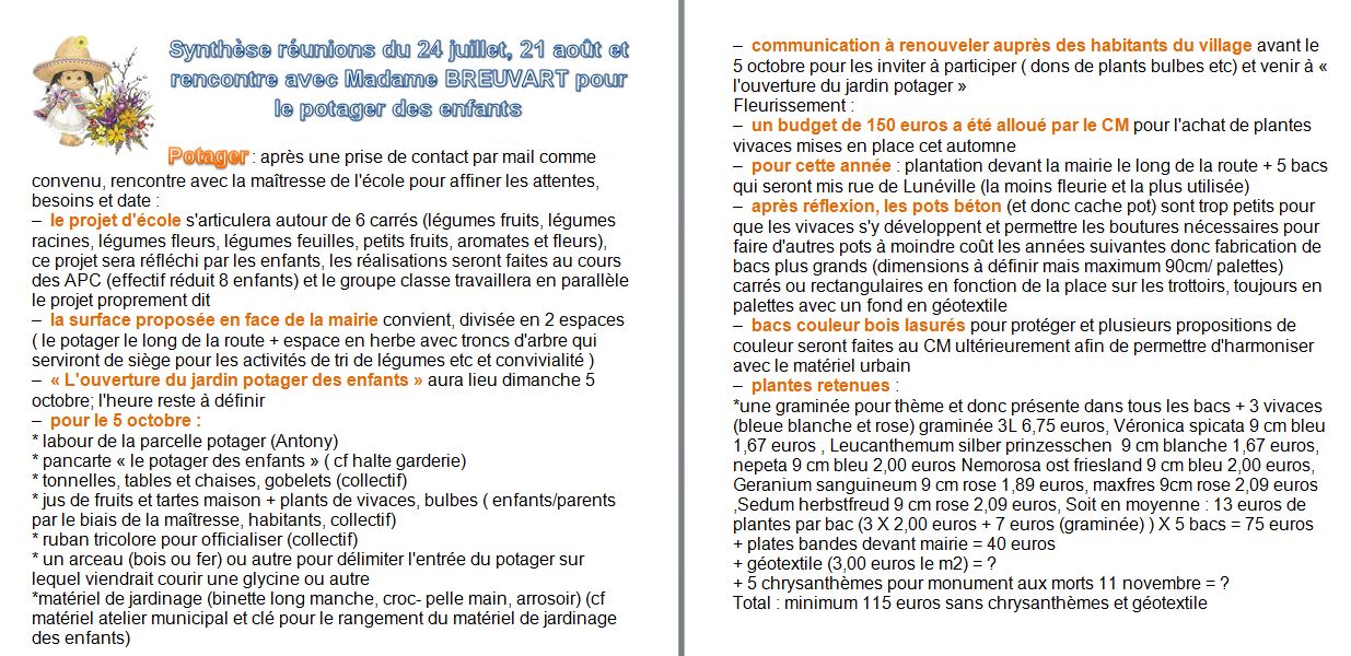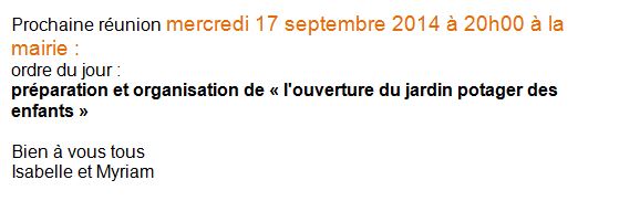 - Prochaine réunion le 8 octobre à 20h : programmation du chantier "Fabrication des bacs" pour la plantation des vivaces.