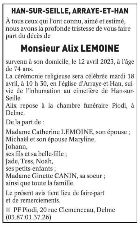 Madame Graindepice Viviane est décèdée.Cérèmonie  samedi à Arraye